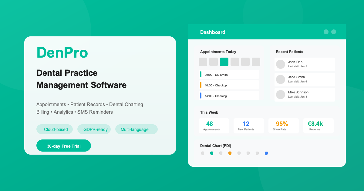 DenPro es un sistema integral de gestión de clínicas dentales en la nube, disponible en 54 idiomas. Atiende a clínicas dentales desde consultorios individuales hasta cadenas de 100 sedes en Europa, Asia, Oriente Medio y América Latina. DenPro se integra directamente con los sistemas nacionales de seguros de salud en más de 7 países.